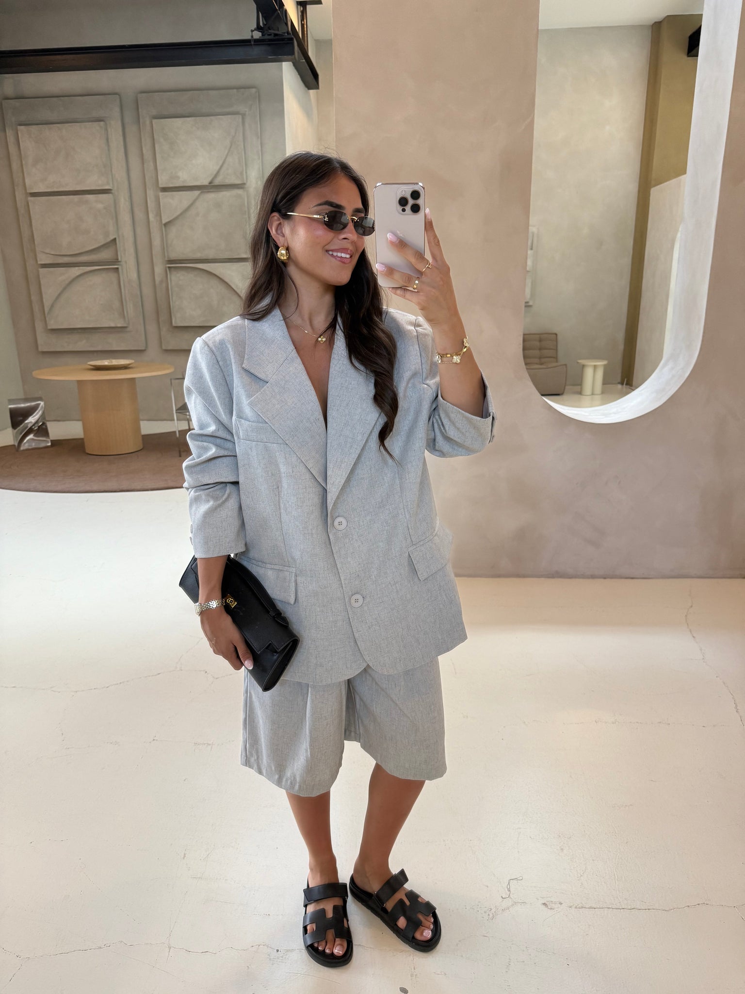 Blazer en taille unique. Le mannequin mesure 1m65. Composition : 85% polyester, 10% lin, 5% elastane.