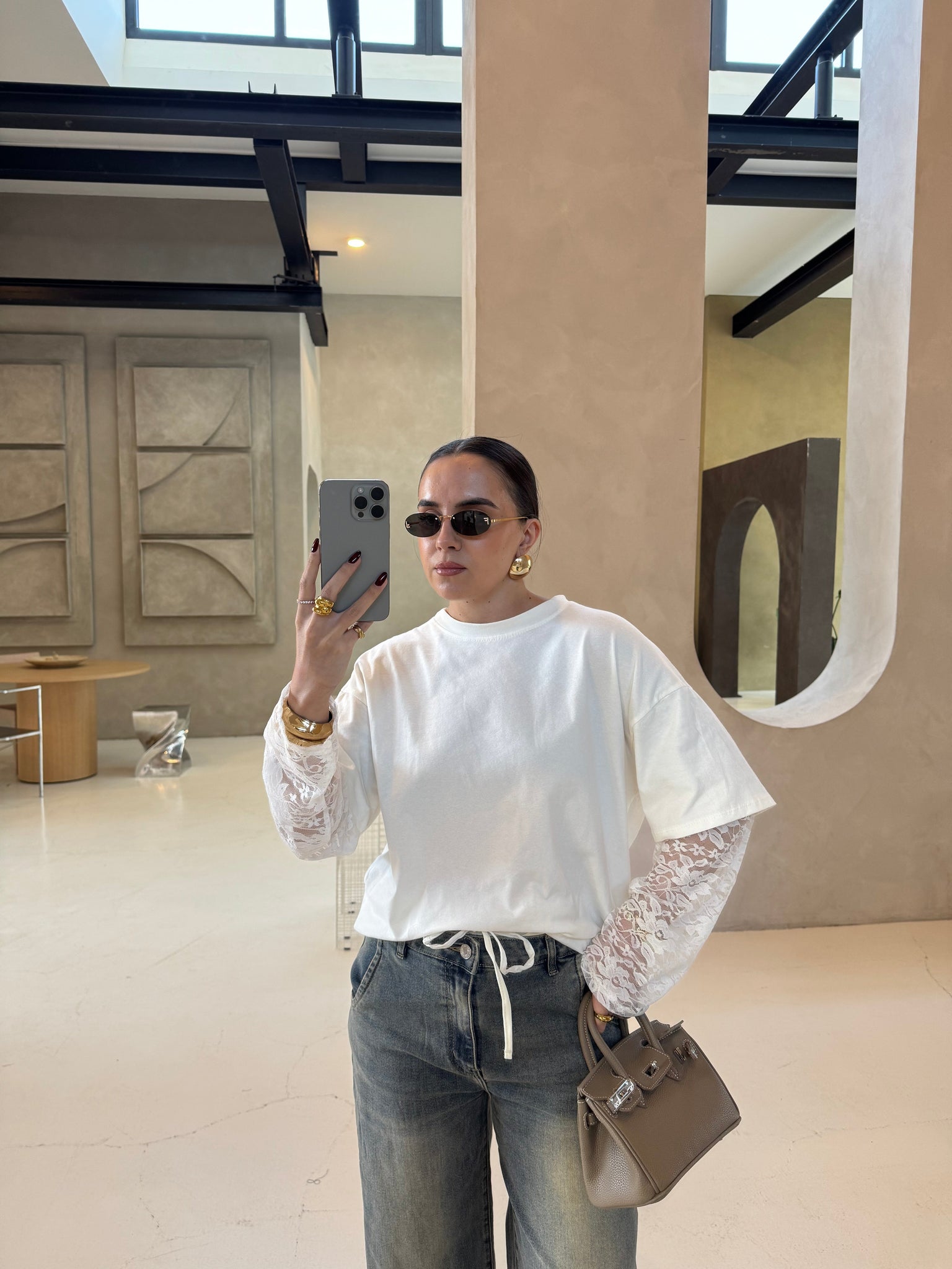 T-shirt en taille unique. Avec détail dentelle sur les manches. Le mannequin mesure 1m60. Composition...