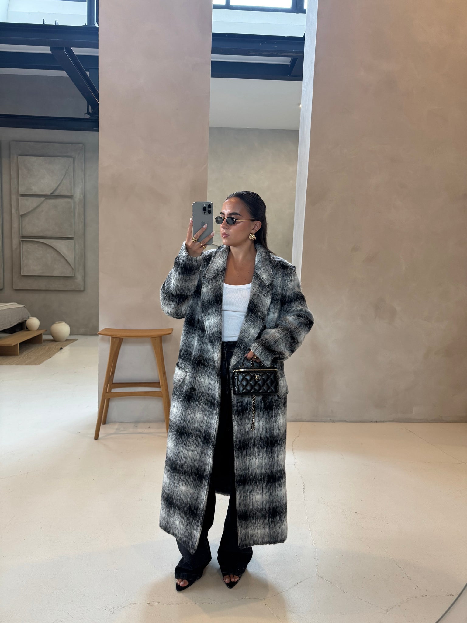 Manteau BELLA long noir à carreaux (W24768)