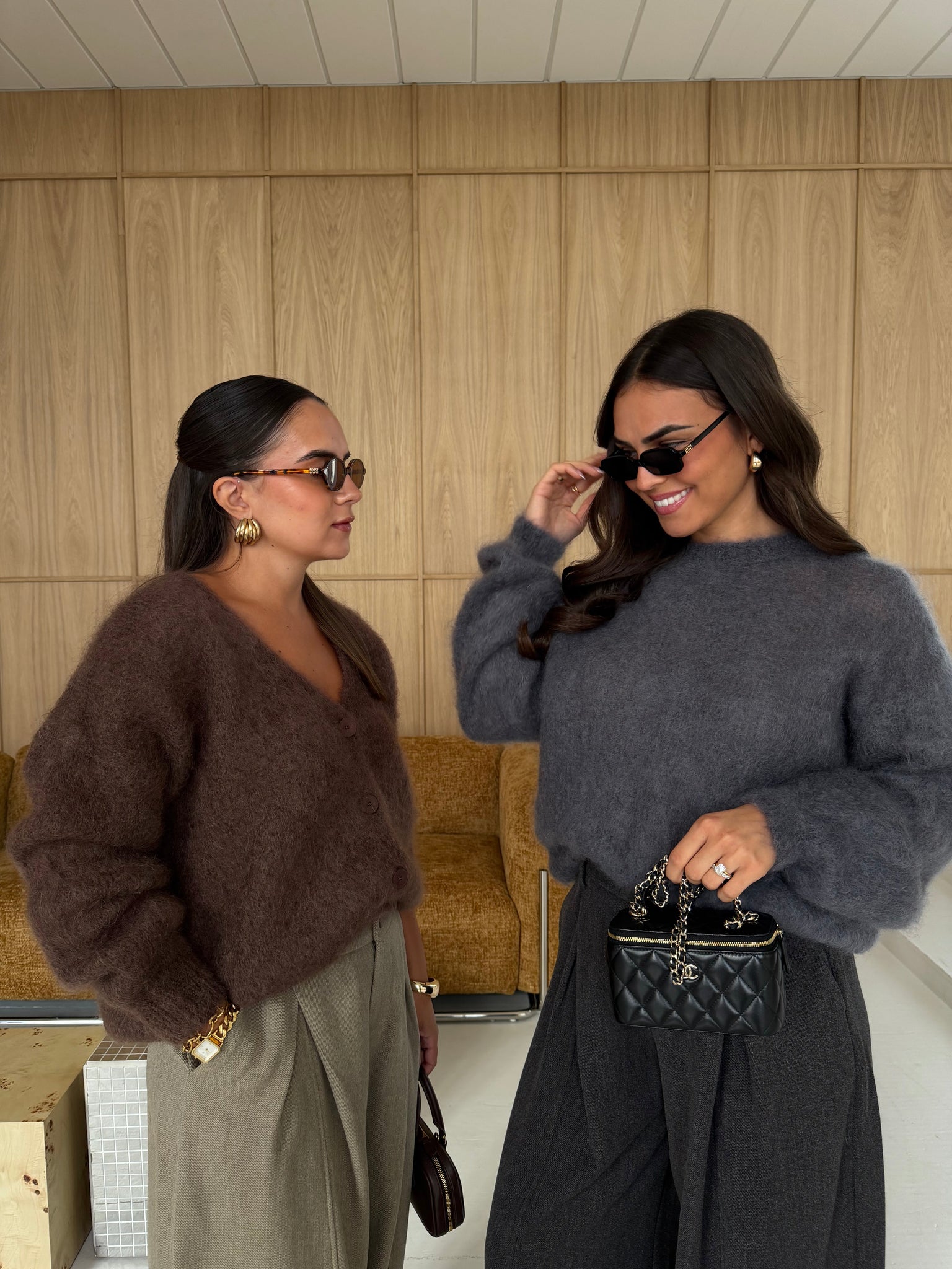 Pull en taille unique. Le mannequin mesure 1m60. Composition : 40%Mohair, 28%Acrilico, 22%Polyamide, 10%Wool.