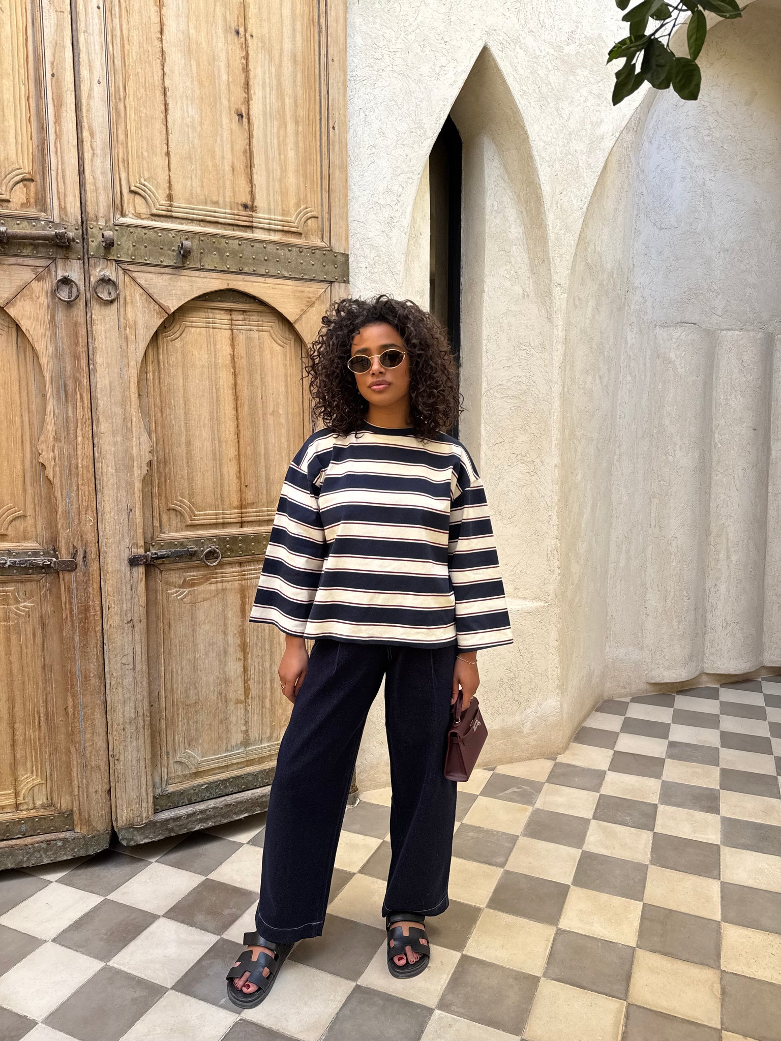 Le mannequin porte une taille S-M et mesure 1m65. Composition : 100% coton.